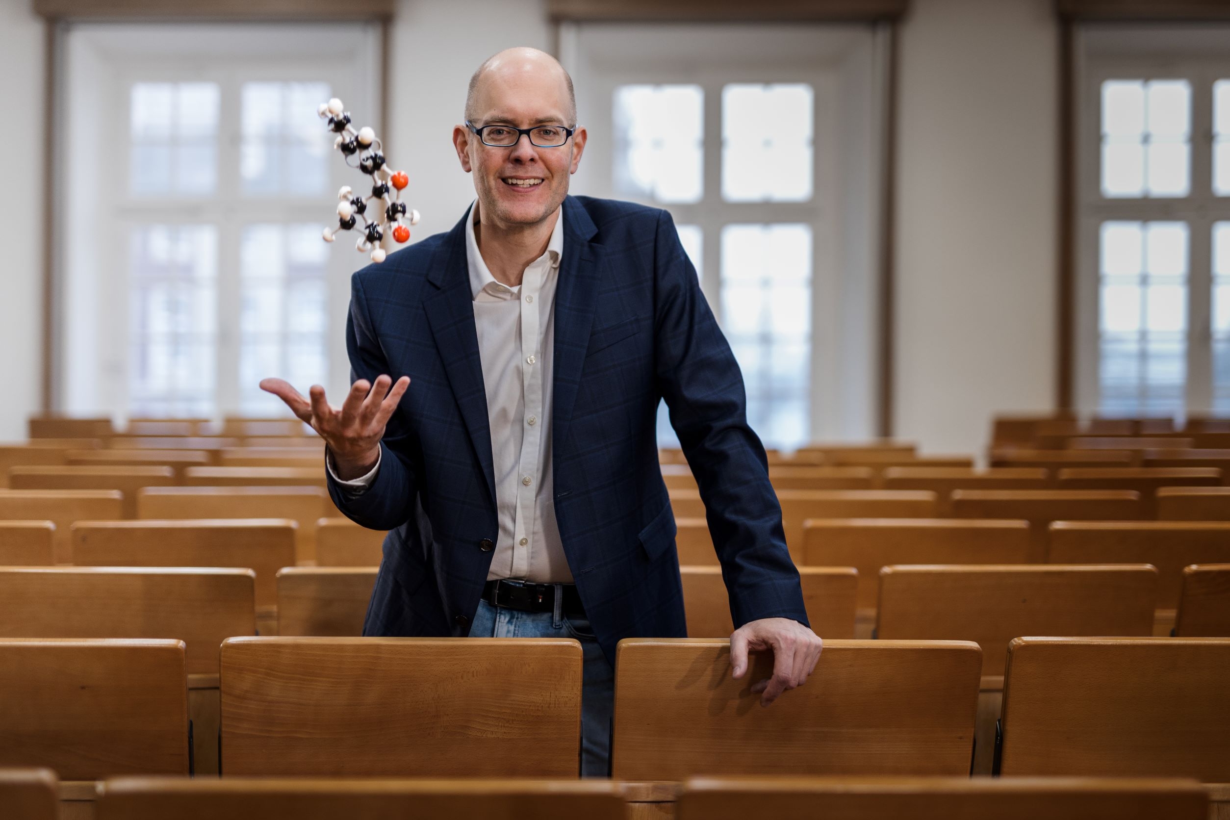 Frank Glorius, geboren 1972 in Walsrode, studierte Chemie an der Leibniz Universität Hannover. Im Jahr 2000 promovierte er in Basel nach Forschungsarbeiten am Max-Planck-Institut für Kohlenforschung, Mülheim/Ruhr, und an der Universität Basel. Nach Stationen an der Harvard University, USA, dem MPI für Kohlenforschung und an der Philipps-Universität Marburg folgte er 2007 einem Ruf an die Universität Münster. Dort ist er bis heute als Professor für Organische Chemie tätig. Für seine Arbeit erhielt Glorius bereits zahlreiche Auszeichnungen und seine Forschung wird aktuell bereits durch den dritten ERC (European Research Council) Grant gefördert. Neben seiner wissenschaftlichen Tätigkeit setzt er sich auch aktiv für die chemische Gemeinschaft ein, beispielsweise im Kuratorium des Fonds der Chemischen Industrie und im Fachkollegium Chemie der DFG. Glorius ist bereits seit achtundzwanzig Jahren aktives GDCh-Mitglied. Unter anderem leitete er in dieser Zeit den Ortsverband Münster und organisierte als Chair die ORCHEM 2022.