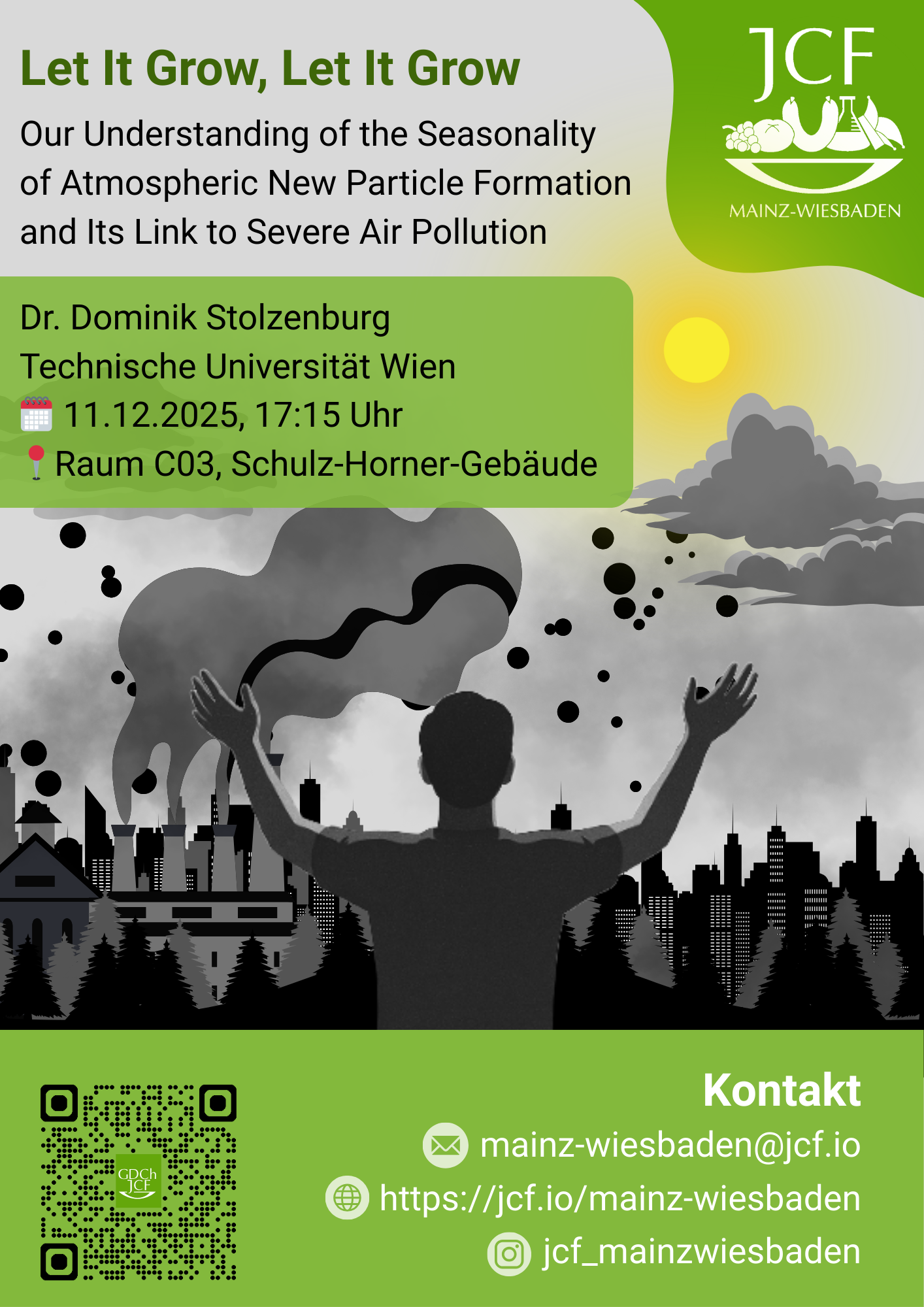 Ein Fachvortrag, der sich sehen lässt! Winterdunst oder Partikelbelastung - zwischen Experiment und Modell. Wie entstehen Partikel in der Atmosphäre? Ist das Partikelwachstum abhängig von der Jahreszeit? Das alles bei Apfelpunsch und Snacks am 11.12.2025 um 17:15 Uhr. Wir freuen uns auf euch!