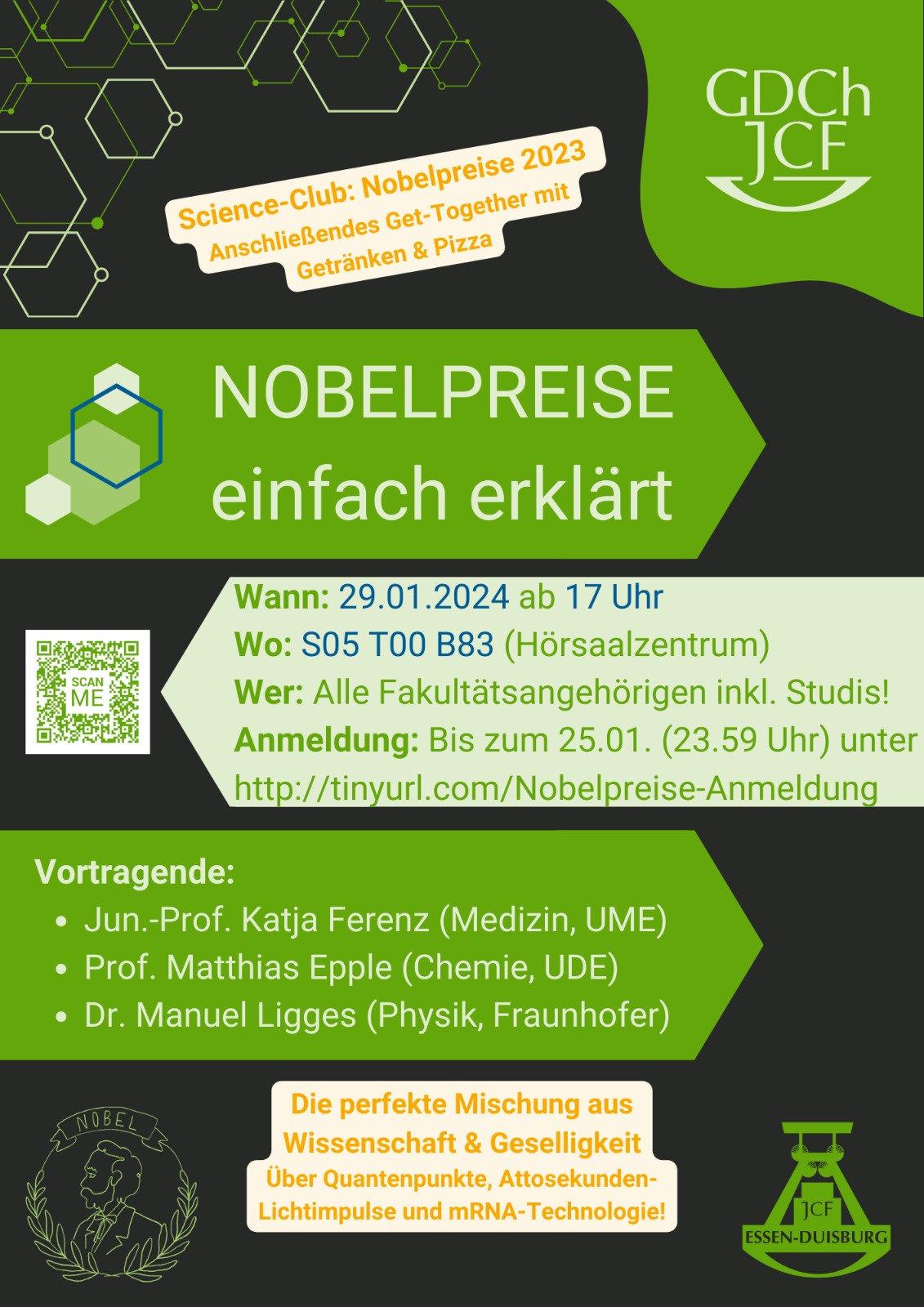 Am Montag, den 29.01.2024 um 17 Uhr, steht ein echtes Highlight an. Wir laden Euch erstmals zum Science-Club mit dem Thema "Nobelpreise 2023 - einfach erklärt!" ein. In 3x 20 Minuten werden Euch drei wundervolle Vortragende in die Welt von Attosekunden-Lichtimpulsen, Quantenpunkten und mRNA-Technologie entführen. Im Anschluss gibt es ein entspanntes Get-Together bei Pizza und Getränken, bei dem Ihr mit Jun.-Prof. Katja Ferenz, Prof. Matthias Epple und Dr. Manuel Ligges ins Gespräch kommen könnt.